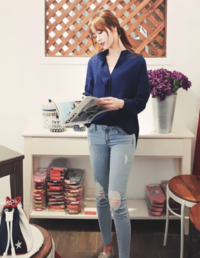 破洞牛仔裤搭配衬衣非常的清新和气质,将衬衣扣子解开两三颗更加时髦和性感,同时也显得更为大方,搭配一双白色休闲鞋,,非常有学院气质,喜欢韩范的菇凉可以尝试哦。