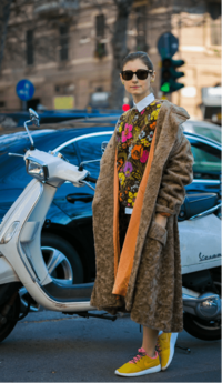白衬衫印花针织衫与皮草质感大衣的叠穿配搭使得整个造型既充满色彩又不会过度繁琐,,皮草的优雅与衬衫的简约很好地相辅相成。