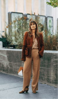 偏暖的色系在视觉上产生柔美的渐变感,丝质的衬衣光滑柔顺,搭配略有绒面质感的阔腿裤更显精致,搭配一件暖色系外套就是优雅十足的秋冬装束。