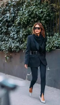 深黑色的套装给人一种庄严的感觉,同时也很显瘦,即使穿着肌肉感的紧身裤,小腿却一点也不显壮。