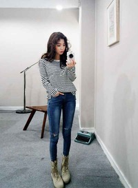 黑白条纹的长袖T恤最具有中性帅气的感觉,而且自带文艺小青年的范儿。搭配随性洒脱的牛仔裤是最常见的组合,整身造型看似漫不经心,低调随意,但却因为有了条纹元素的加入而增添了不少眼球和回头率。