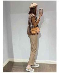 咖色衬衫叠穿同色系的渐变毛衣背心,搭配浅咖色的翻边西裤,再加上同色系的板鞋和贝雷帽的装饰.........咖色系的同色系穿搭,颜色上下统一看着别提多舒服了。