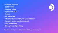今日(10月1日),V社公布Steam Deck 9月最受欢迎游戏前十榜单,排名顺序是以总游玩时长进行排序。