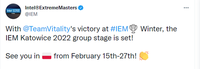 IEM宣布,2022年IEM卡托维兹八张直通正赛名额的邀请函已经全部放出,Vitality和VP凭借在IEM冬季赛冠军和3-4名的好成绩拿到了最后的入场券。