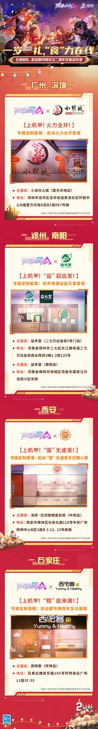 相伴两载,纵横寰宇。为了让机动都市的驾驶员们感受到火热的庆典氛围,《机动都市阿尔法》携手五大城市的知名品牌,,以主题店和联动套餐商品的形式为玩家送上惊喜,更有特别福利等候解锁。届时玩家可以前去这些店铺体验,让自己在本次二周年庆典中留下一段“舌尖上”的回忆。