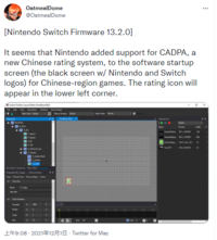 根据国外玩家推特用户OatmealDome的数据挖掘发现,,本次Nintendo Switch 13.2.0版本更新中增加了中国音像与数字协会(CADPA)的“游戏适龄提示”分级图标。OatmealDome表示任天堂似乎在中国地区游戏的软件启动屏幕上增加了对中国新评级系统CADPA的支持。该评级图标将出现在《健康游戏忠告》(48字的标语)左下角。