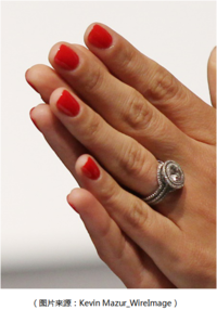 娜塔莉·波特曼的订婚戒指由她的丈夫本杰明·米勒皮德(Benjamin Millepied)和珠宝设计师共同创作而成。戒指充分考虑了波特曼的喜好和顾虑,以可回收铂金打造长廊底座,上面镶有一颗重约4克拉的古董旧矿式切割钻石,以密镶钻石的双光环环绕,营造大气优雅的独特氛围,融入满满爱意。
